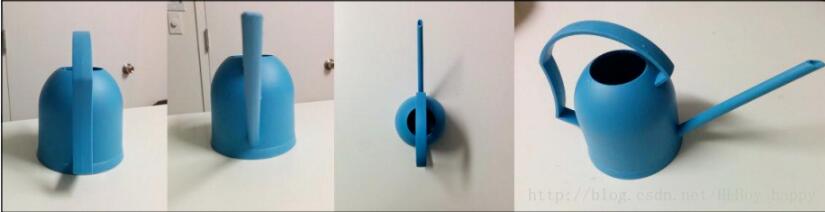 假如你是一本养花工具宣传册的摄影师,你正在拍摄一个水壶。水壶是三维的,但是照片是二维的,为了更全面的把水壶展示给客户,你需要从不同角度拍几张图片。下图是你从四个方向拍的照片: