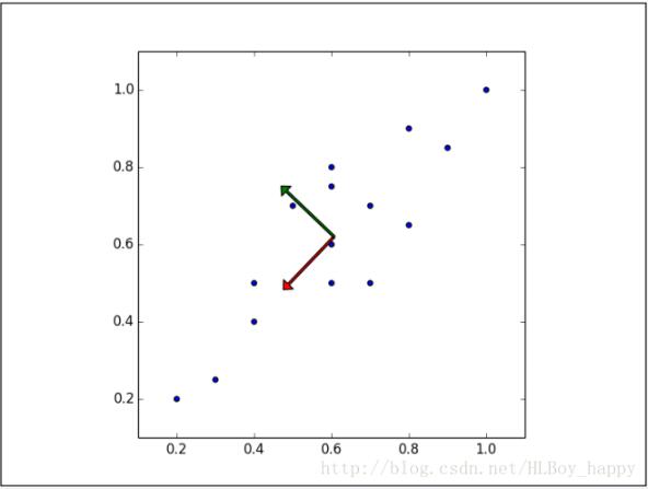 显然,样本映射到黑色虚线的变化比映射到红色点线的变化要大的多。实际上,这条黑色虚线就是第一主成分。第二主成分必须与第一主成分正交,也就是说第二主成分必须是在统计学上独立的,会出现在与第一主成分垂直的方向,如下图所示: