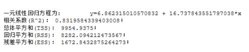 message2 = ('回归平方和(RSS): ' + str(Regression) + ';' + '\n残差平方和(ESS): ' + str(Residual) + ';' + '\n')