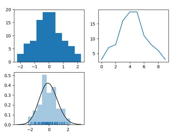 from scipy import stats import matplotlib.pyplot as plt import numpy as np import seaborn as sns arr = np.random.normal(size=100) # plot histogram plt.subplot(221) plt.hist(arr) # obtain histogram data plt.subplot(222) hist, bin_edges = np.histogram(arr) plt.plot(hist) # fit histogram curve plt.subplot(223) sns.distplot(arr, kde=False, fit=stats.gamma, rug=True) plt.show()