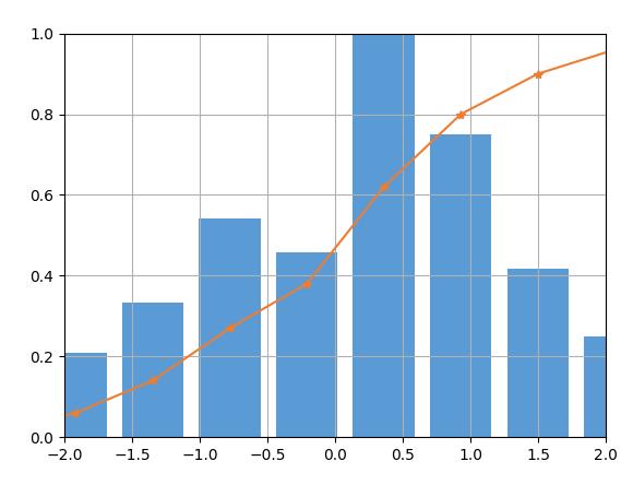 from scipy import stats import matplotlib.pyplot as plt import numpy as np import seaborn as sns arr = np.random.normal(size=100) hist, bin_edges = np.histogram(arr) width = (bin_edges[1] - bin_edges[0]) * 0.8 plt.bar(bin_edges[1:], hist/max(hist), width=width, color='#5B9BD5') cdf = np.cumsum(hist/sum(hist)) plt.plot(bin_edges[1:], cdf, '-*', color='#ED7D31') plt.xlim([-2, 2]) plt.ylim([0, 1]) plt.grid() plt.show()