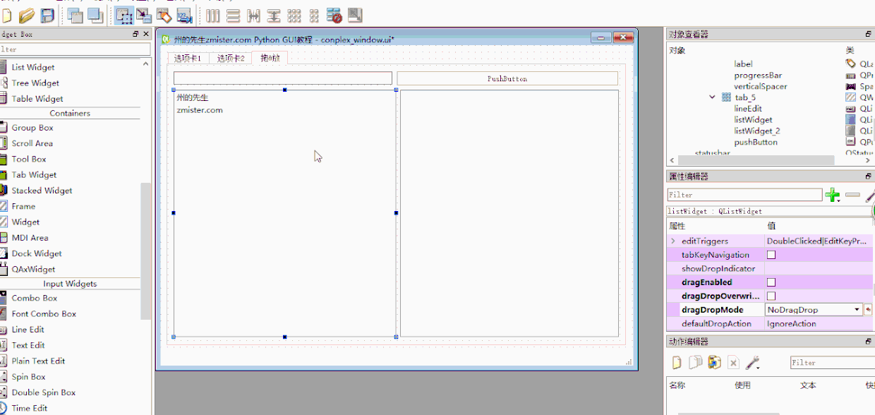 对于简单的拖放效果,我们可以直接使用Qt设计师中的选项进行设置。例如,我们直接可以使用dragEnable属性、dragDropOverwriteMode属性、dragDropMode属性为ListWidget部件设置拖放功能: