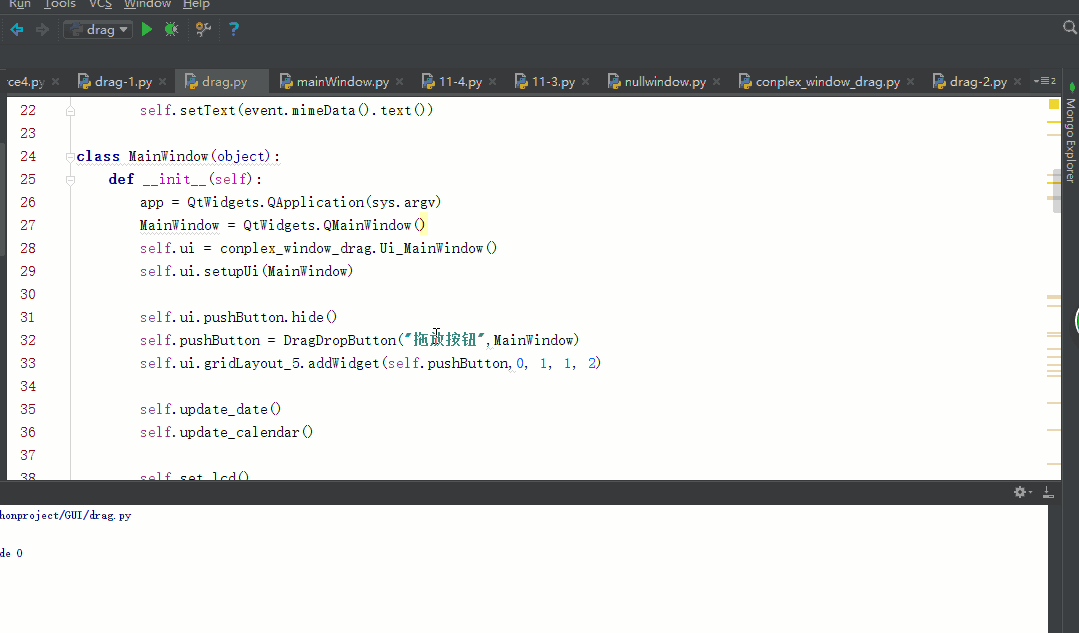 我们使用setAcceptDrops属性设置按钮接收拖放事件,创建一个dragEnterEvent()方法用来设置拖的事件响应,创建一个dropEvent()方法用来设置放的事件响应。