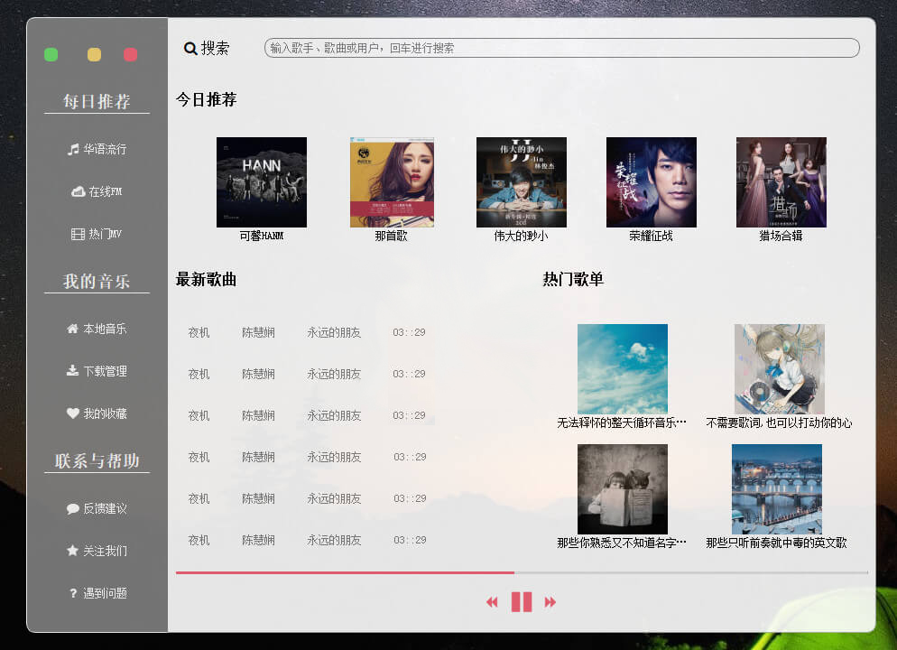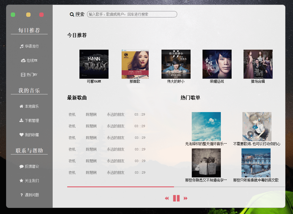 因为图形界面是会呈现出无边框的圆角形式,所以右侧的部件的右上角和右下角需要先行处理为圆角的,同时背景设置为白色。对推荐模块、音乐列表模块和音乐歌单模块的标题我们也需要对其字体进行放大处理,所以最后的样式为: