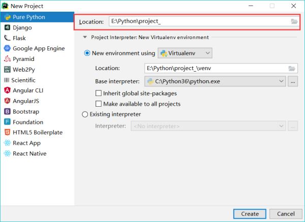 2.进入新项目设置页面,修改新项目默认安装路径,点击Create:
