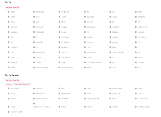 (2): turtle.circle(radius, extent=None, steps=None)描述: 以给定半径画圆