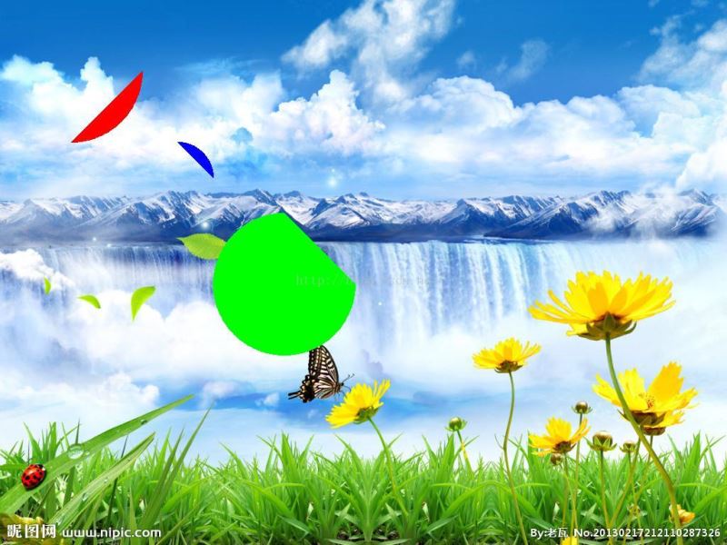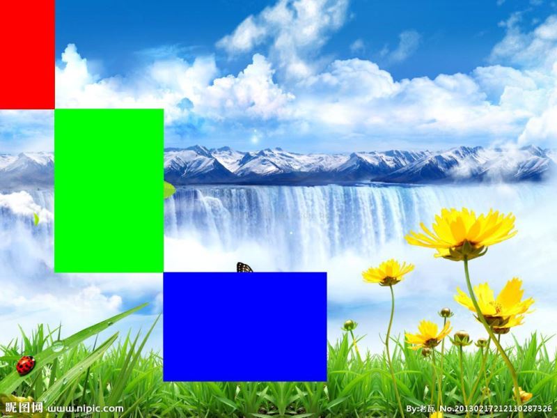 在图像01上(0,0,200,200)区域使用红色绘制了90度的弧,(300,300,500,500)区域使用绿色绘制了270度的弧,(200,200,300,300)区域使用蓝色绘制了90度的弧。这些弧都是按照顺时针方向绘制的。变量start/end的0度为水平向右,沿着顺时针方向依次增加。绘制后的图像01如下图: