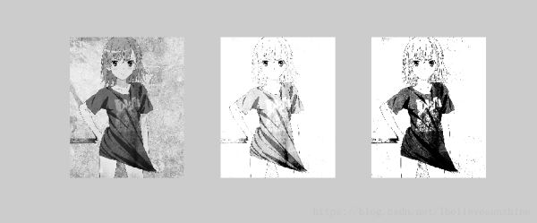 左侧是原图,中间是调整图像灰度并加强亮色值的输出后显示的图像,右侧是调整图像灰度并加强暗色值的输出后显示的图像。