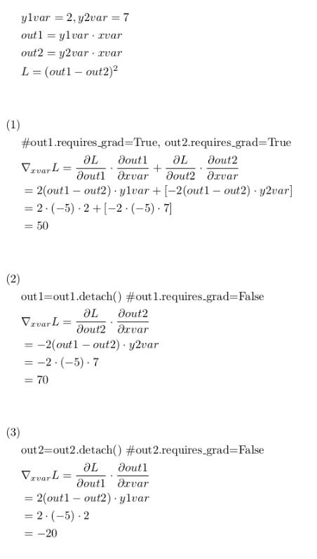 (3)中,L对xvar的求导只计算out1部分,因为out2的requires_grad=False;