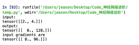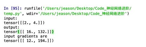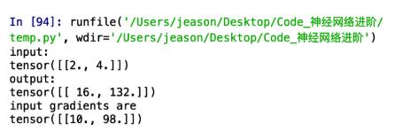么?我是谁?我再哪?为什么就给我2个数,而且是 8 + 2 = 10 ,96 + 2 = 98 。难道都是加的 2 ?想一想,刚才咱们backward中传的参数是 [ [ 1 , 1 ] ],难道安装这个关系对应求和了?咱们换个参数来试一试,程序中只更改传入的参数为[ [ 1 , 2 ] ]: