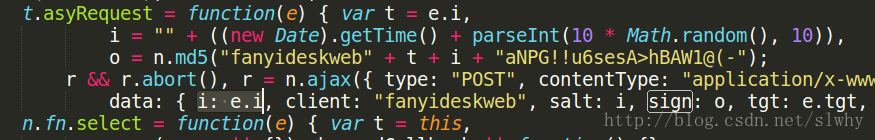 大家发现 sign 的值,也就是 o 一共是对四个参数进行求 md5 码,两个是定值,一个是前面求到的时间戳,还有一个是什么呢?这个地方我也找了挺久的(还是不懂 js 的痛啊,哭。。。)剩下的参数,就是图片中所谓的 t