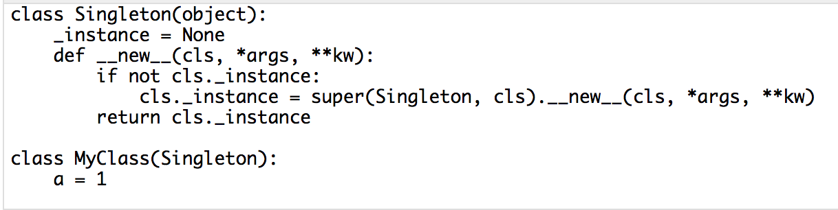 其实,Python 的模块就是天然的单例模式,因为模块在第一次导入时,会生成.pyc文件,当第二次导入时,就会直接加载.pyc文件,而不会再次执行模块代码。因此,我们只需把相关的函数和数据定义在一个模块中,就可以获得一个单例对象了。如果我们真的想要一个单例类,可以考虑这样做: