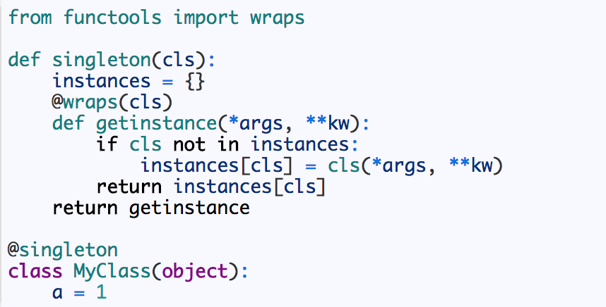 在上面,我们定义了一个装饰器singleton,它返回了一个内部函数getinstance,该函数会判断某个类是否在字典instances中,如果不存在,则会将cls作为 key,cls(*args, **kw)作为 value 存到instances中,否则,直接返回instances[cls]。