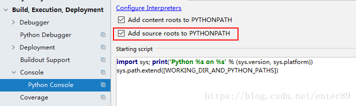(1). 打开File--> Setting—> 打开 Console下的Python Console,把选项(Add source roots to PYTHONPAT)点击勾选上