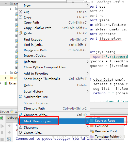 (2). 右键点击自己的工作空间文件夹,找到Mark Directory as 选择Source Root,问题解决!
