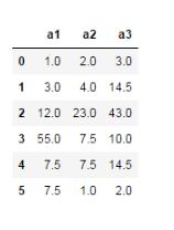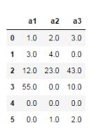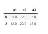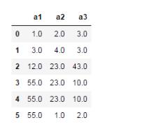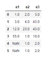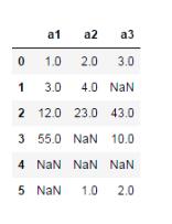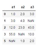 import numpy as np import pandas as pd df = pd.DataFrame([[1,2,3],[3,4,np.nan], [12,23,43],[55,np.nan,10], [np.nan,np.nan,np.nan],[np.nan,1,2]], columns=['a1','a2','a3'])