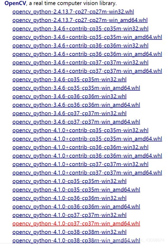 1)先下载win版本的opencv并extract,然后在opencv\build\python\cv2下选择对应python版本文件夹下(比如我的是python-3.7)的 .pyd文件(cv2.cp37-win_amd64.pyd)。