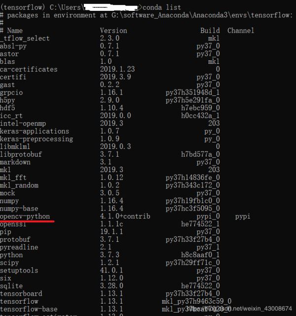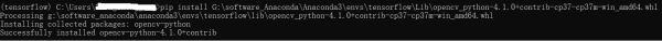 之后用pip安装,输入:pip install G:\software_Anaconda\Anaconda3\envs\tensorflow\Lib\opencv_python-4.1.0+contrib-cp37-cp37m-win_amd64.whl