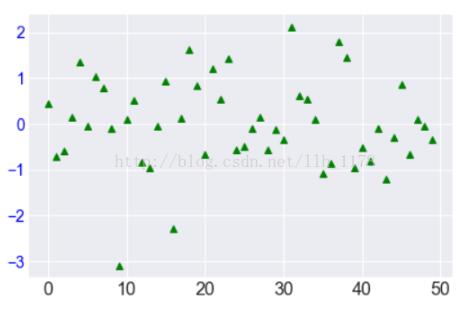 mpl.rcParams['xtick.labelsize'] = 16 mpl.rcParams["ytick.color"] = 'b' plt.plot(range(50), data, 'g^') plt.show()