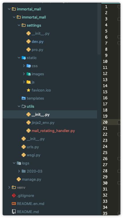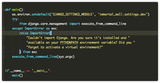 项目使用码云进行源代码版本控制,在码云创建好后直接克隆到本地即可,然后在项目根目录下执行virtualenv venv创建虚拟环境,source venv/bin/activat激活虚拟环境后,安装django后,执行 django-admin startproject immortal_mall创建django工程。