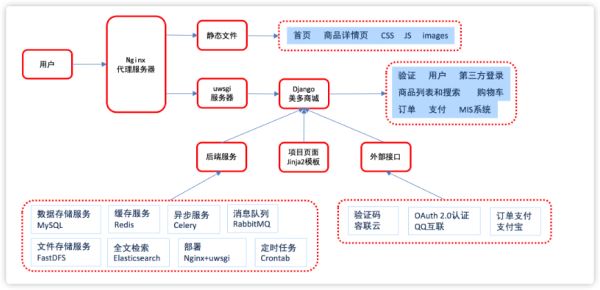 该电商项目类似于京东商城,主要模块有验证、用户、第三方登录、首页广告、商品、购物车、订单、支付以及后台管理系统。项目开发模式采用前后端不分离的模式,为了提高搜索引擎排名,页面整体刷新采用jinja2模板引擎实现,局部刷新采用vue.js实现。