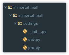 商城项目有两个环境,分别为测试环境和开发环境,django项目在创建完成后只有一个settings配置文件,但是两个环境需要两个配置文件,这里需要修改django获取配置文件的方式。新建settings包,再新建dev和pro两个配置文件,将默认生成的settings文件里面的内容拷贝至dev和pro文件里,结果如下