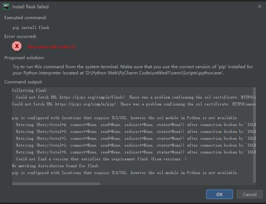 在PyCharm中创建项目时自动安装flask时的失败提示