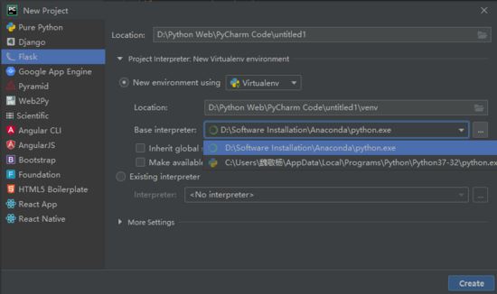 当我再次尝试创建一个新的flask项目时,我多留意了一下创建时可选的一些配置,my god,我感到有些崩溃,原来~~~PyCharm创建的这个虚拟环境默认是根据我暂时没怎么用的anaconda中的来的。