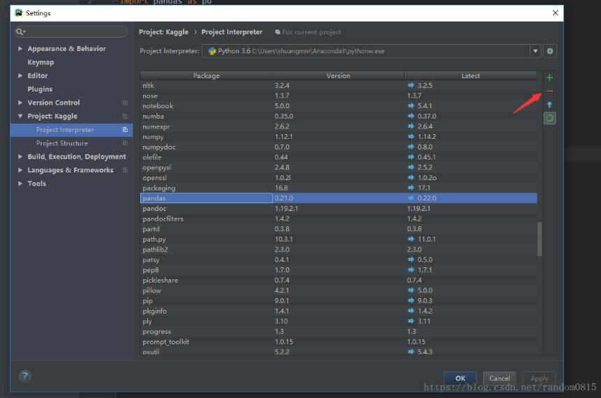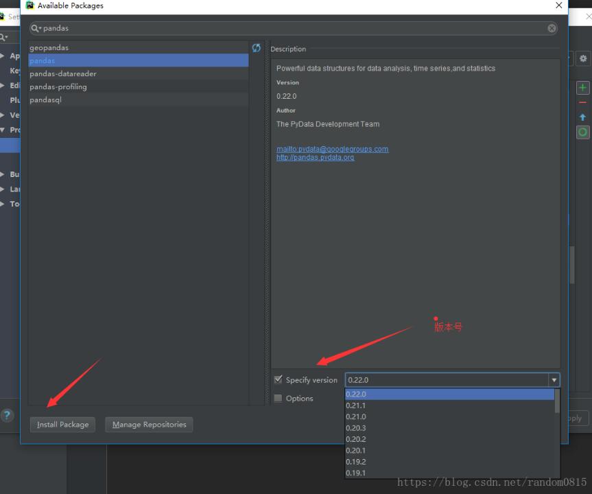 等待成功之后点击绿色的加号重新安装,搜索pandas。。注意右下角有版本号,我就是换了两个版本号之后才安装好的