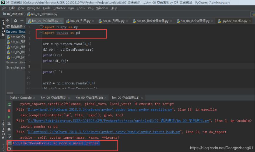 在模块中写入import pandas as pd,运行后报错ModuleNotFoundError: No module named ‘pandas'
