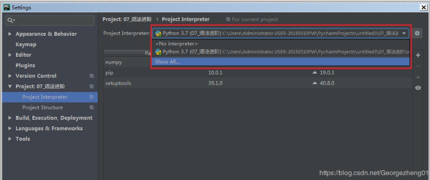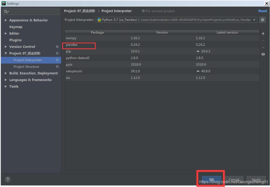 Files→Settings→Project:07_语法进阶(注:当前项目名)→Project Interpreter→右侧Project Interpreter下拉栏→点击“Show All”→选择已经安装有Pandas的项目(注:我这里选的是自己已经创建的zx_Pandas)→这时候可以看到所选项目中已安装的包。点击OK