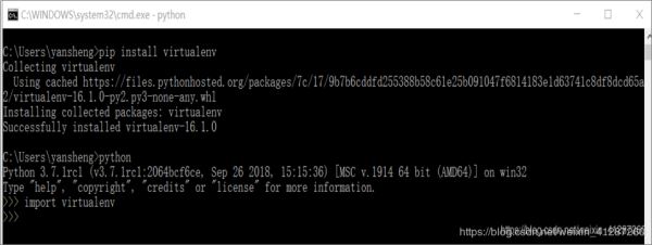 在cmd控制台 pip install xxxx 后并显示安装成功后,并且尝试用cmd 的python 中import xxxx ,没有显示异常,说明这个库是安装成功了的。(这里以安装 virtualenv 为例:)