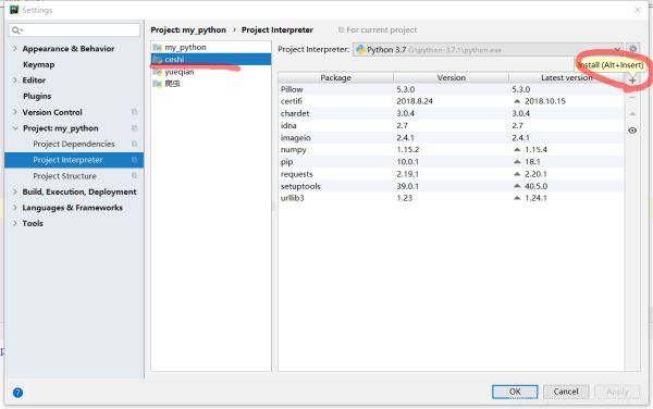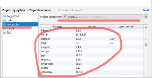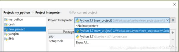 这里有两个解释器(为什么下面再详解),一个是该项目目录下的,另一个是python安装目录下的(注:我的python安装路径为:G:\python-3.7.1),新建项目,好像默认是用该项目目录下的解释器的(当然这个设置在新建项目时是可以修改的,这里只讲默认的),我们应该把这个改成python安装目录下的解释器。