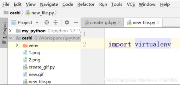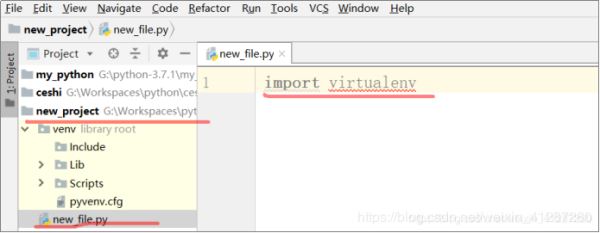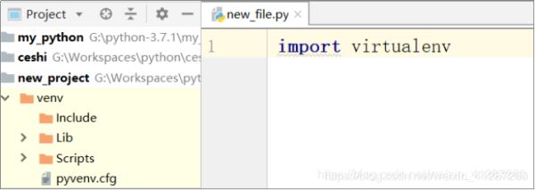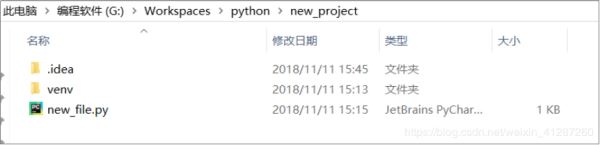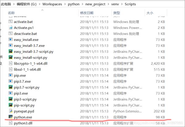 (2).而新建项目时,pycharm会在该项目里面新建一个解释器(现在应该知道上面为什么会有两个解释器了吧,就是这个原因!!!),该解释器路径:G:\Workspaces\python\new_project\venv\Scripts