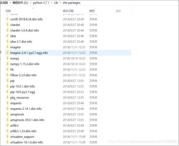 2. windows下python的pip install 安装路径为:G:\python-3.7.1\Lib\site-packages,这里面放的都是下载的第三方库。(可以看到最后面两个,就是我之前用cmd下载的库virtualenv)