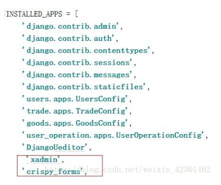 接下来就是在setting中注册xadmin和crispy_forms到INSTALLED_APPS,接下来就是在我们的urls.py文件中配置路由