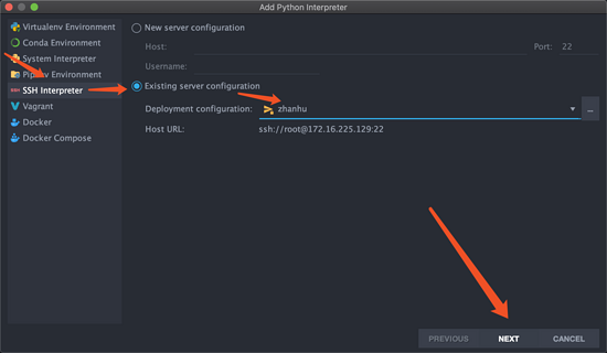 选择SSH Interpreter,选择上一步中设置的服务器。当然也可以填写服务器的 Host 地址,端口Port,用户名Username,填好后,下一步Next。