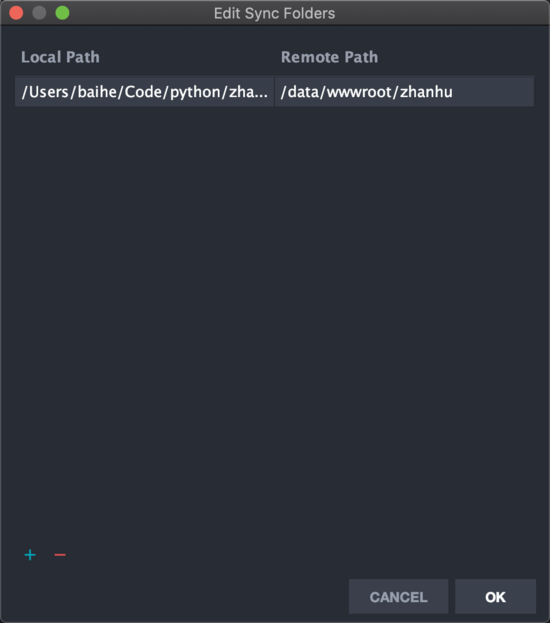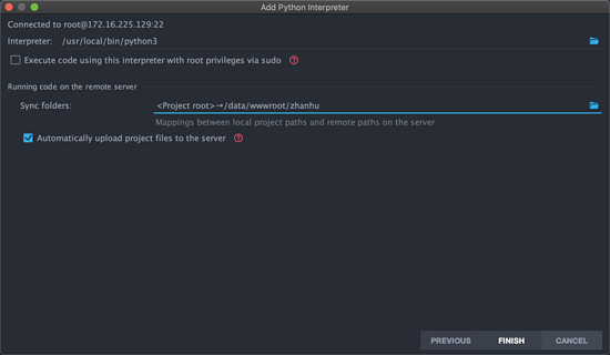 选择远程服务器上Python解释器的位置,服务器上的远程同步文件夹Sync folders,可以选择多个。如果不知道Python安装在哪,可以远程连接服务器后,使用 命令 which python 找到Python安装位置。