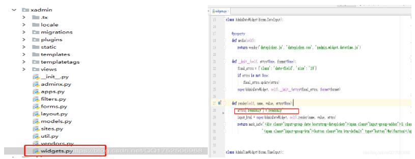 1,需要修改xadmin 文件 ,在widgets.py --->第28行添加attrs["readonly"] ="readonly"