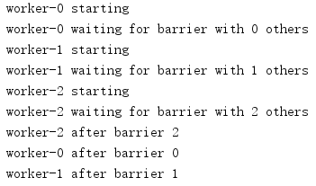 在这个例子中,Barrier被配置为会阻塞线程,直到3个线程都在等待。满足这个条件时,所有线程被同时释放从而越过这个控制点。wait()的返回值指示了释放的参与线程数,可以用来限制一些线程做清理资源等动作。