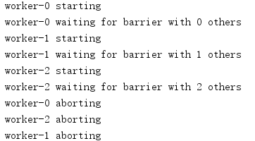 这个例子将Barrier配置为多加一个线程,即需要比实际启动的线程再多一个参与线程,所以所有线程中的处理都会阻塞。在被阻塞的各个线程中,abort()调用会产生一个异常。