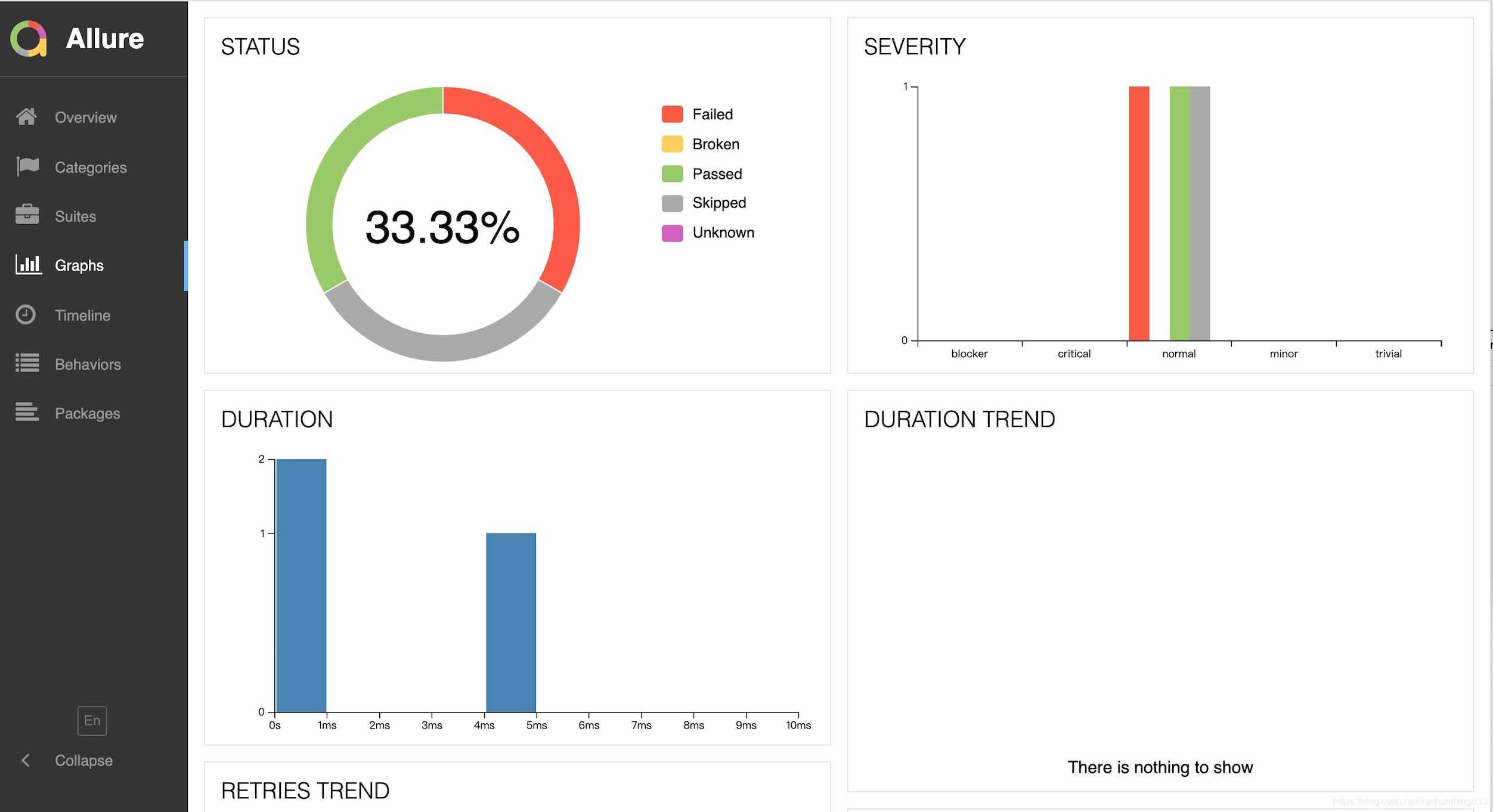 打开生成的测试报告后,浏览器被自动调起,展示测试报告。下面我们分别看看测试报告的几个页面。