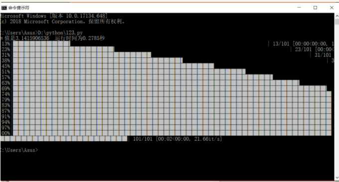 运行时间为{:.4f}秒".format(k,clock())) for i in tqdm(range(101)): print("\r{:3}%".format(i),end="") sleep((clock())/100)#用执行程序的总时间来算出进度条间隔的时间