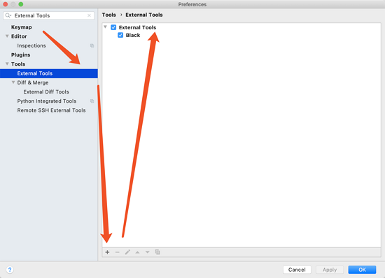 Name: Black Description: Black is the uncompromising Python code formatter. Program: /Library/Frameworks/Python.framework/Versions/3.6/bin/black Arguments: "$FilePath$" Working directory: $ProjectFileDir$