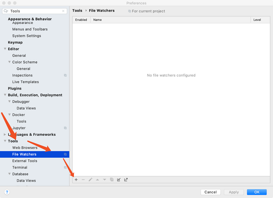 选择 Preferences or Settings -> Tools -> File Watchers 添加一个新的 watcher