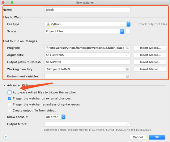 Name: Black File type: Python Scope: Project Files Program: /Library/Frameworks/Python.framework/Versions/3.6/bin/black Arguments: $FilePath$ Output paths to refresh: $FilePath$ Working directory: $ProjectFileDir$ Uncheck "Auto-save edited files to trigger the watcher"