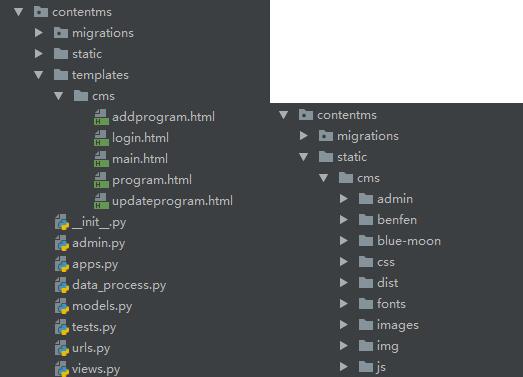 如下图所示,展现是contentms 下面的文件,一般新建app,直接在app里面,新建templates和static文件夹,然后将对应的文件放入到里面就行,但是当项目中建立多个app,解决同名冲突,需要在templates下再创建一个文件夹,这样就解决假设有两个app中都有main.html页面,到底跳转到哪个页面的问题,在views.py文件页面跳转 render中在html前加上外面的文件夹的名称,这里是cms,