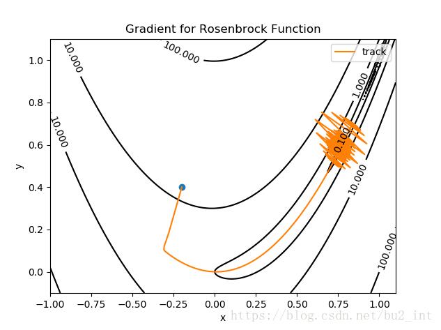 图中蓝色的点为起点,橙色的曲线(实际上是折线)是寻找最小值点的轨迹,终点(最小值点)为 (1,1)(1,1)。