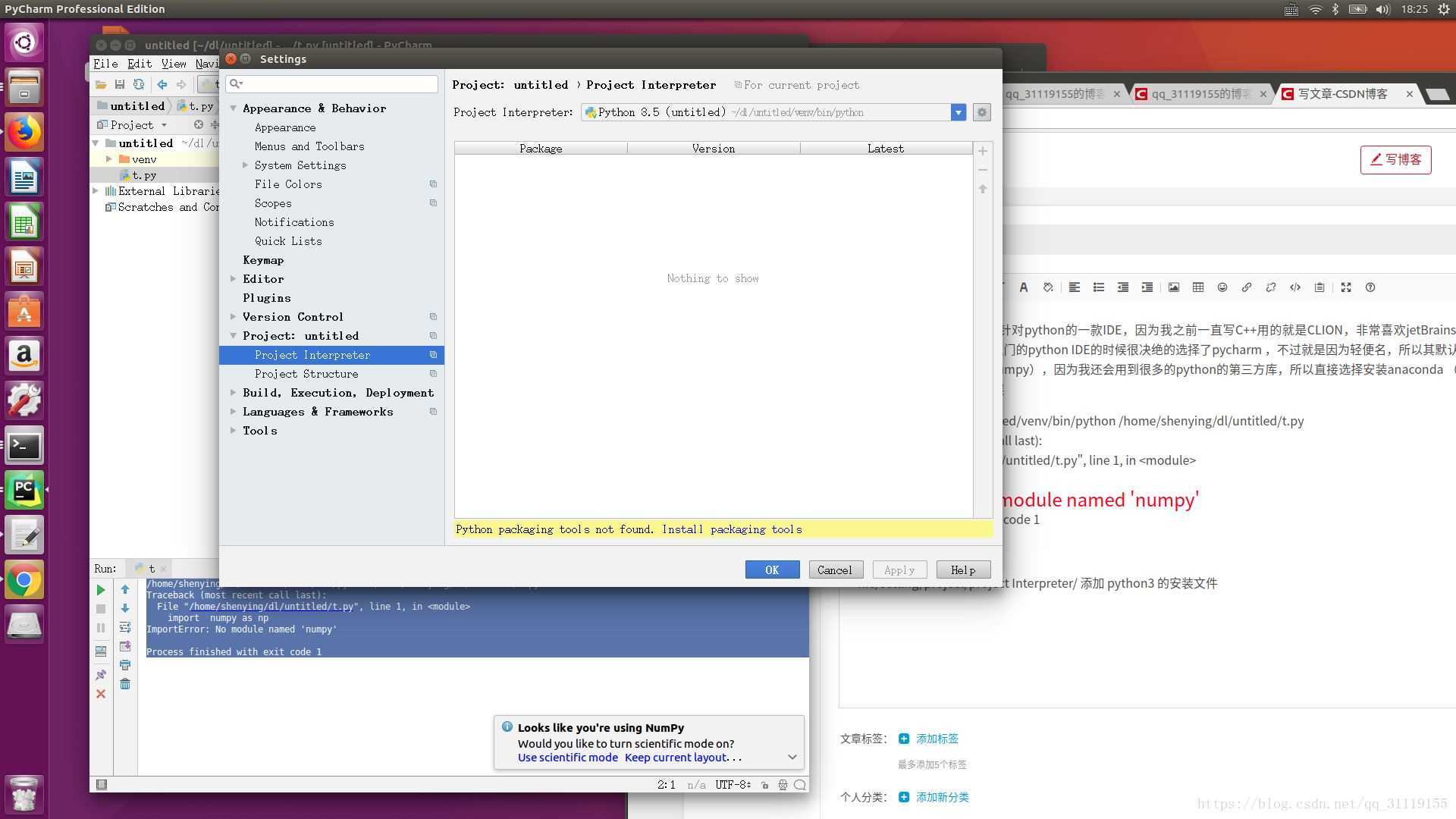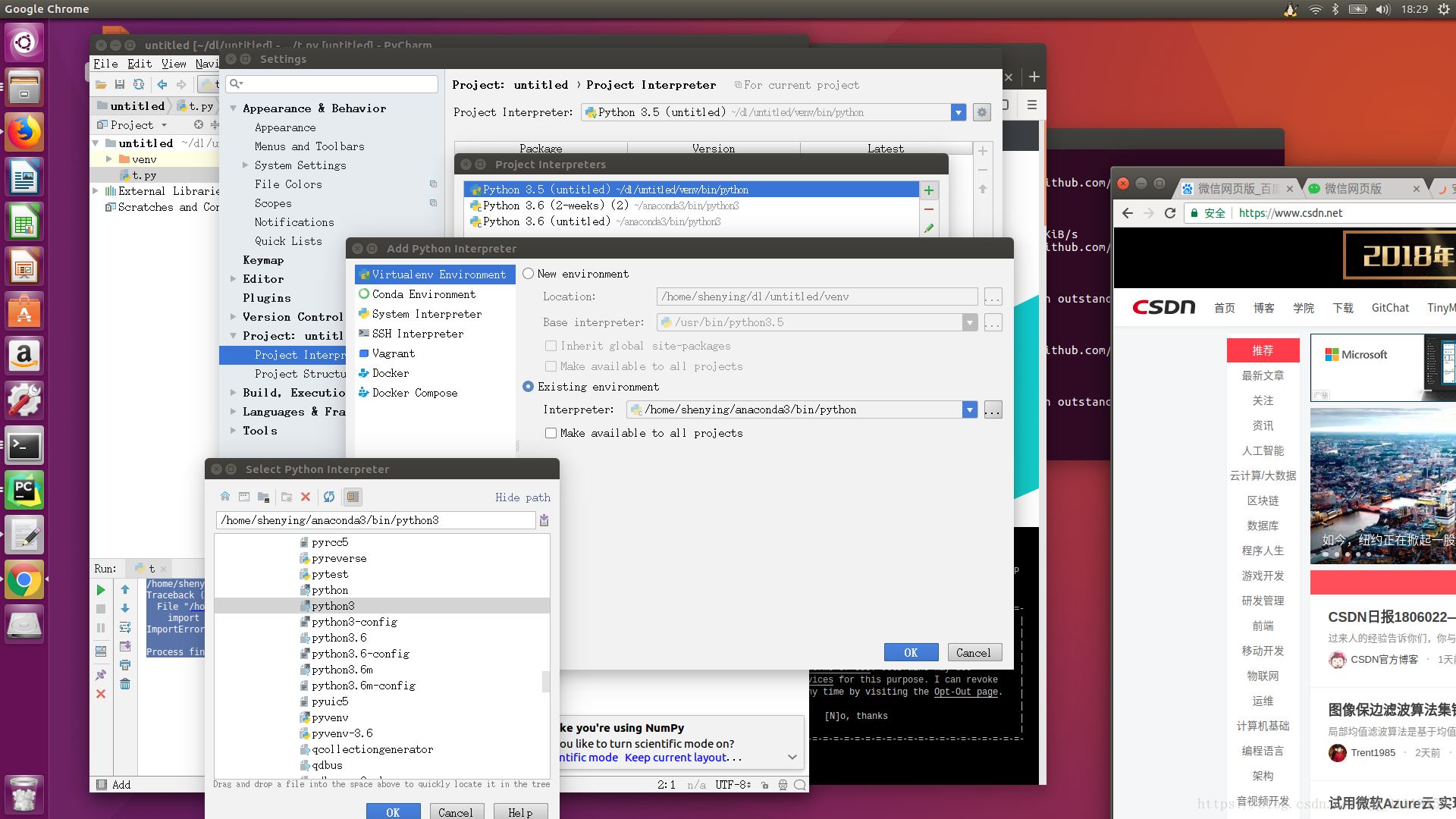 由于pycharm是jetBrains 针对python的一款IDE,因为我之前一直写C++用的就是CLION,非常喜欢jetBrains家简便清洁的风格,所以面对市面上五花八门的python IDE的时候很决绝的选择了pycharm ,不过就是因为轻便名,所以其默认的编译器不包括一般的python 库(比如 numpy),因为我还会用到很多的python的第三方库,所以直接选择安装anaconda (如何安装见前一blog),会出现这样的错误