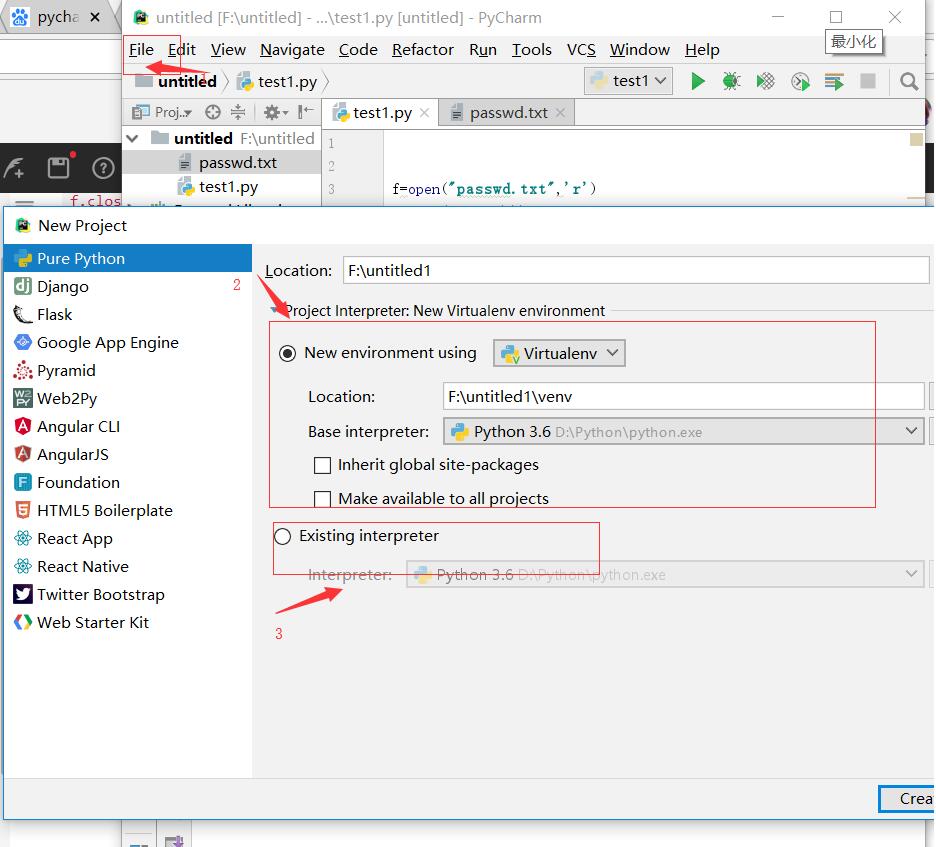 如果选择的是2就是使用了pycharm提供的虚拟解释器,又因为passwd.txt文件不是在虚拟环境中的所以就没有输出。